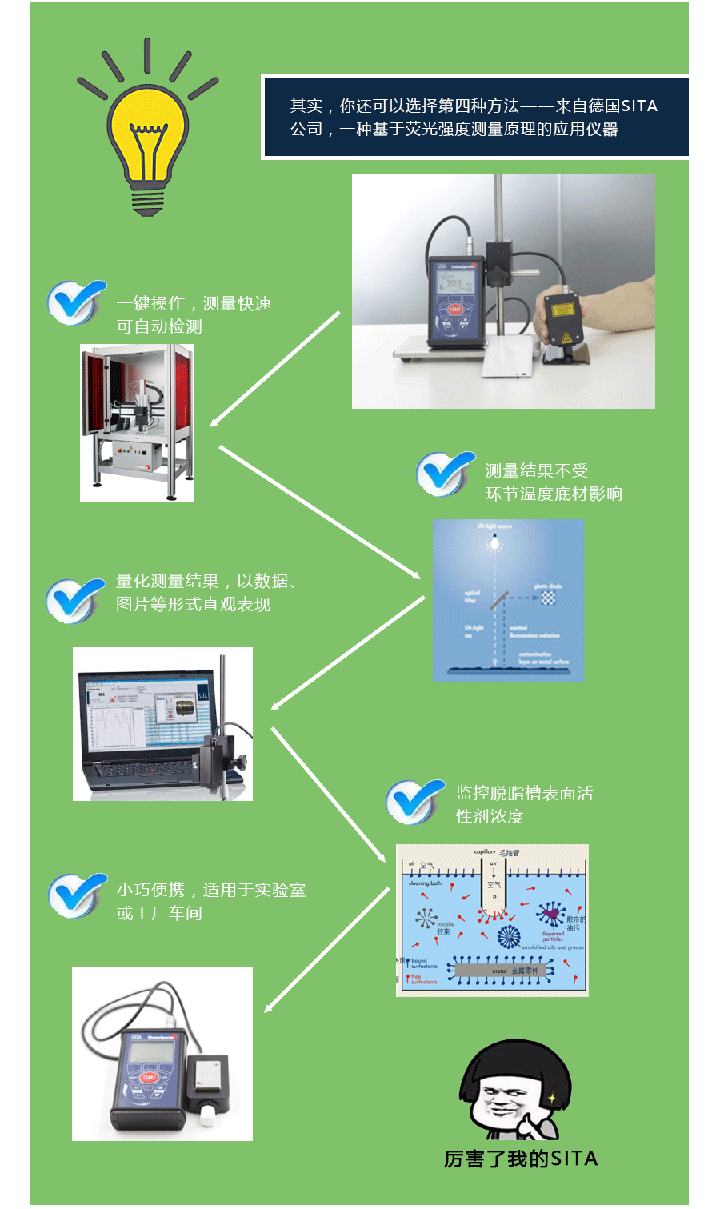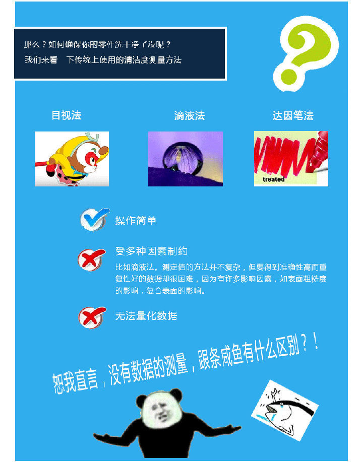 手機金屬、陶瓷、玻璃外殼、屏幕、指紋片,在衝(chong) 壓、CNC、拋光、絲(si) 印時,無可避免地使用到各種切削液、潤滑油、冷卻液、拋光物質和膠水等。假如在進行表麵處理——如陽極氧化、電鍍、噴砂及AF鍍膜前,這些汙染物質有殘留,便極容易出現附著力不良、顏色不均勻、斑點等問題。而傳(chuan) 統的測試方法,如目測、達因筆測試,都無法保障清洗質量穩定性。