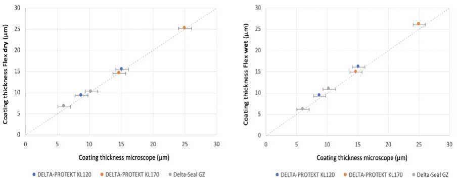 圖:比較顯微鏡法和Flex在幹燥狀態下測量塗層厚度(左:Flex測量幹膜,右:Flex測量濕膜)。兩(liang) 種測量設備具有很高的相關(guan) 性(R2 = 0.998)。顯微鏡測量法的標準誤差小於(yu) 1.5 μm,coatmaster Flex的測量標準誤差小於(yu) 0.3 μm。