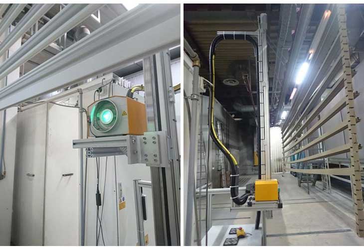 Coatmaster塗魔師非接觸式測厚係統結合線性垂直移動裝置對移動的板材進行在線測厚。