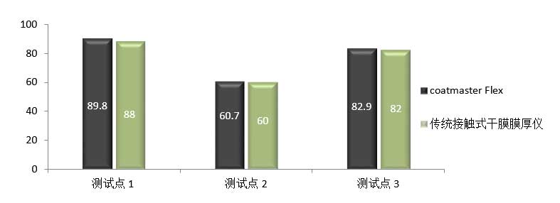 使用塗魔師coatmaster非接觸膜厚分析儀(yi) 與(yu) 幹膜測厚儀(yi) 在鋁型材上同一位置對比測試,測試數據差異小於(yu) 5微米。,且塗魔師coatmaster Flex重複性和精度更好;