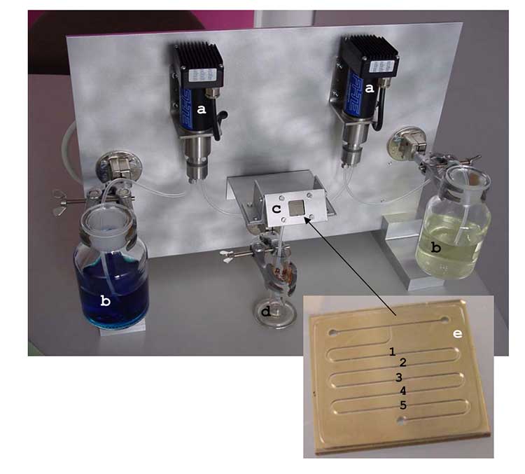 整個(ge) 微型反應器係統需要兩(liang) 台外部計算機來控製的微型齒輪泵(微型齒輪泵品牌:HNPMikrosysteme GmbH),確保兩(liang) 種離析物的混合比例以及反應器核心內(nei) 化學成分的平均停留時間都能達到較佳狀態。