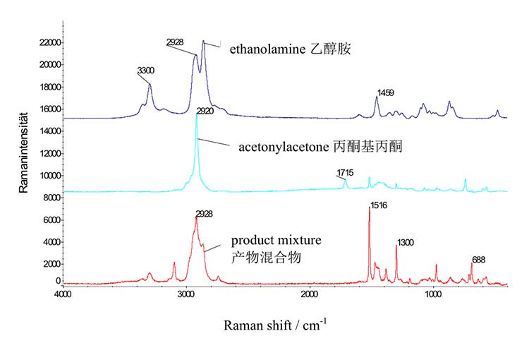 目前理想的光譜分析方法是拉曼光譜,因為(wei) 拉曼信號不會(hui) 被吸收或受到玻璃蓋影響。選擇Paal-Knorr-合成作為(wei) 測試化學反應,使用丙酮基丙酮和乙醇胺離析物,它們(men) 的產(chan) 物是取代吡咯。離析物和產(chan) 物的混合物的拉曼光譜如圖3所示。