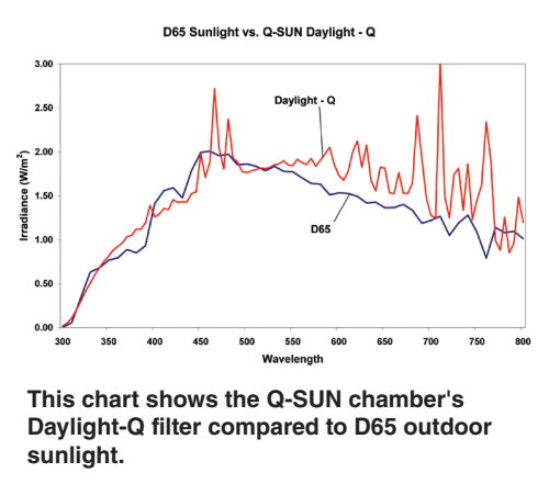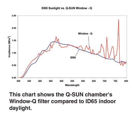 ICH指南沒有規定光譜是否應與(yu) D65或ID65匹配。通常,ID65光譜是用Q-SUN中的WINDOUS-Q 濾光片模擬的,因為(wei) 它模擬了進入建築物內(nei) 部的陽光。然而,日光濾光片適用於(yu) 室外應用,如染發劑和防曬霜。