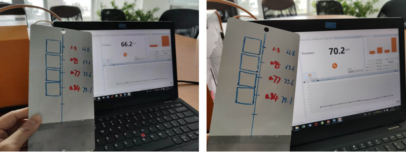 測試結果說明塗魔師在線非接觸無損測厚係統可以精準測量金屬板上的漆膜厚度,重複性好!使用塗魔師在線非接觸測厚係統對汽車車漆塗層進行及時修正工藝偏差,使得汽車車漆塗層快速精準達到合格範圍。