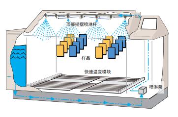 噴淋功能用於(yu) 某些汽車腐蝕試驗規範。用戶可調流量的溶液通過特別固定的噴嘴均勻地噴淋到試樣上:
