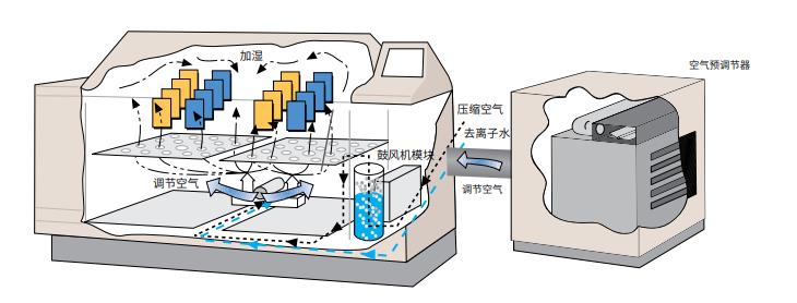 在幹燥功能下,鼓風機將由空氣加熱器加熱的箱外空氣送入試驗箱內(nei) 。由此在試驗箱內(nei) 形成低濕環境,使試樣幹燥。箱內(nei) 溫度由箱內(nei) 加熱器和空氣加熱器來控製。在靜置功能狀態下(圖中未標出),隻有箱體(ti) 加熱器控製箱體(ti) 空氣溫度。Q-FOG CRH 型號使用RH控製,替代了幹燥和靜置。
