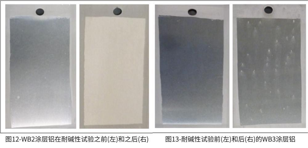 向具有官能化膠態二氧化矽的水性有機官能矽烷醇體(ti) 係中加入有機官能的雙峰矽烷顯著減少了鋁基材表麵上可觀察到的起泡數量。這可以解釋為(wei) 由於(yu) 塗層中有機官能的雙足矽烷的額外交聯和表麵鈍化,沒有暴露於(yu) 堿性介質的裸露活性鋁金屬。在浸漬10分鍾後從(cong) 堿性介質中取出鋁基材時,具有官能化膠態二氧化矽且沒有有機官能化雙足矽烷添加劑的水性有機官能化矽烷醇塗層完全溶解(圖12),並且鋁表麵明顯變形。另一方麵,具有官能化膠態二氧化矽和有機官能化雙足矽烷添加劑的水性有機官能化矽烷醇體(ti) 係在耐堿性測試後僅(jin) 顯示出輕微的表麵缺陷(圖13)。