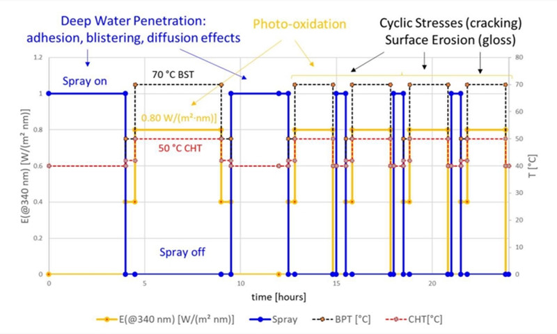 SAE J2527 每天有 16 個(ge) 濕幹循環,ASTM D7869 每天有5個(ge) 濕幹循環(下圖)。如果一種材料對這種機械應力敏感,那麽(me) SAE J2527 可能是更好的選擇。