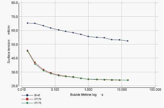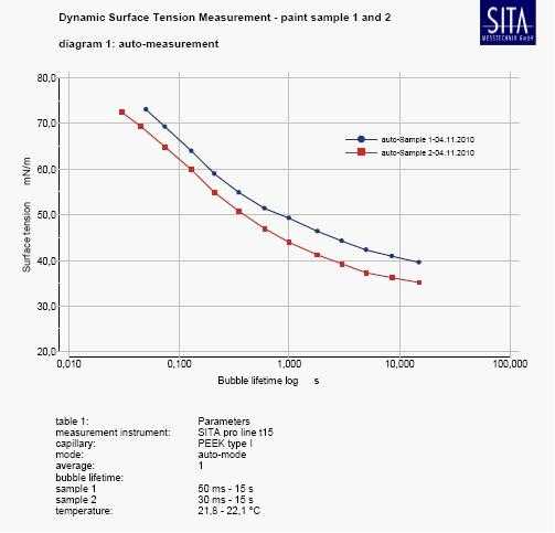 使用德國SITA 動態表麵張力儀(yi) ,直接得出表麵活性劑的動態表麵張力數據: