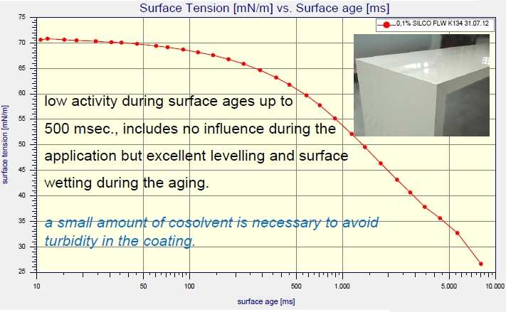 上圖為(wei) 某品牌0.1%流平劑水溶液,在500ms氣泡壽命以內(nei) 的表活遷移速度很慢,對塗布時潤濕沒有影響。 在500ms以上的氣泡壽命,表麵張力下降很快。在實際應用中,流平時可以達到很好的效果。
