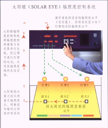 由上圖可知,Q-sun通過主板控製燈管的光照強度,燈管發光後,由機器內(nei) 部的光照強度傳(chuan) 感器探頭感應到光強,再反饋回主板進行分析比較,然後再進行調節,直到實際的照度值與(yu) 設定值一致。當照度設定好後,整個(ge) 調節過程由機器自動進行。