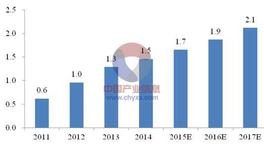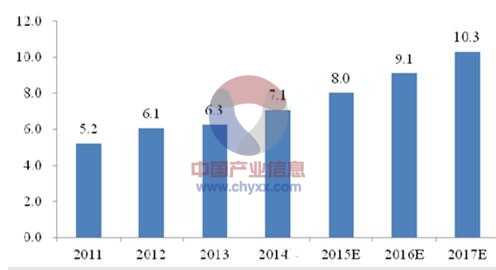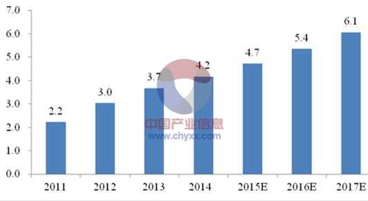 我國是全球主要的鞋類、服裝、防水透濕織物、高檔手袋及皮具、箱包等產(chan) 品生產(chan) 基地,也是全球主要的 TPU 薄膜消費國。據中國塑協統計,我國 TPU 薄膜市場規模已從(cong) 2008 年的 8.1 億(yi) 元增長至 2013 年的 18.4 億(yi) 元,預計 2013-2017 年我國TPU 薄膜市場規模年複合增長率將達到 13.3%,消費額將從(cong) 2013 年的 18.4 億(yi) 元增至 2017年的約 30.3 億(yi) 元。