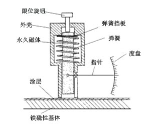 圖解:圖中下部鐵磁性基體(ti) 是被測物體(ti) ,由鐵磁性基體(ti) 和塗層構成,其餘(yu) 部分是機械式磁法測厚裝置,或稱作探頭。