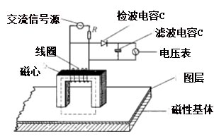 當塗層厚度不同時 ,磁回路的磁阻將不同 ,即塗層厚度較薄時 ,回路的磁阻小;塗層厚度較厚時,回路的磁阻大。磁阻的變化導致了電感線圈的電感量和阻抗的變化。在信號源和內(nei) 阻R參數不變的情況下,電感兩(liang) 端的電壓將隨塗層厚度的變化而變化,即利用此電壓可表征塗層厚度。這時將此電壓送至二極管D檢波和電容器C濾波後 ,經標度變換,送至電壓表或數碼顯示電路,顯示出塗層厚度值。