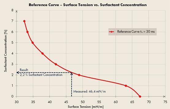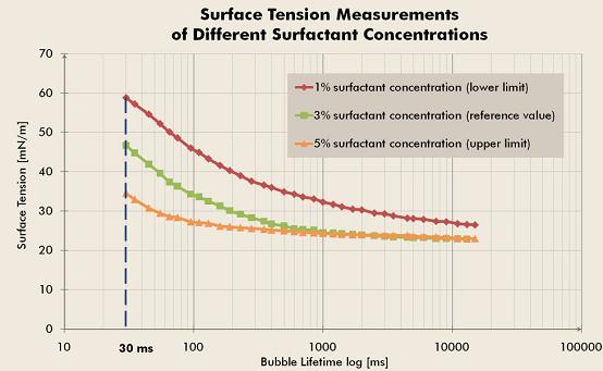 準備足夠數量的不同濃度的樣品,它們(men) 必須能夠涵蓋整個(ge) 應用範圍。使用步驟1得到的較佳汽泡壽命時間,測定並製作表麵張力與(yu) 濃度的關(guan) 於(yu) 曲線坐標圖。