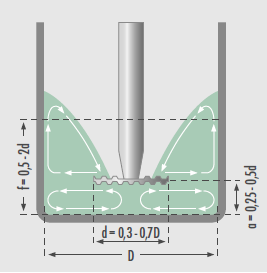 在這個(ge) 階段,該DISPERMAT分散機為(wei) 物料轉換高機械功率的能力應被利用。一個(ge) 人必須不要怕使用高轉速。如果這個(ge) 正在使用的分散盤直徑為(wei) 25毫米的,該DISPERMAT必須運行在15 rpm的轉速,為(wei) 了獲得20米/秒的圓周速度。最後的分散時間通常達到10到15分鍾。