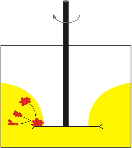 樹脂溶液中加入顏料和填料後,通過增加軸的轉速,物料進入層流模式,直到容器壁上見不到粘附的材料。在合適的轉速下,軸的周圍會(hui) 形成一個(ge) 通道並逐漸能看見分散盤,這時物料就形成了甜甜圈形狀的流型。甜甜圈流型的形成是表示輸入到物料中的機械功率已達最大,此外,由於(yu) 物料被攪動,故所有的團聚體(ti) 都能抵達分散盤外沿。