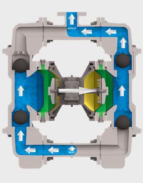 隔膜泵有兩(liang) 個(ge) 對稱的裝有彈性隔膜的工作腔,用隔膜連杆連成一體(ti) ,壓縮空氣從(cong) 泵的進氣接頭進入中間體(ti) 後,推動兩(liang) 個(ge) 工作腔內(nei) 的隔膜,驅動連杆聯結的隔膜同步運動。同時,另一工作腔中的氣體(ti) 則從(cong) 其隔膜的背麵排出泵外。當活塞達到行程終點,配氣閥機構則自動的將壓縮空氣引入另一工作腔,推動隔膜泵朝反向運動,這樣就形成了兩(liang) 個(ge) 隔膜的同步往複運動,而單向球閥的運動使得內(nei) 容積改變,從(cong) 而實現液體(ti) 連續的吸入和排出。