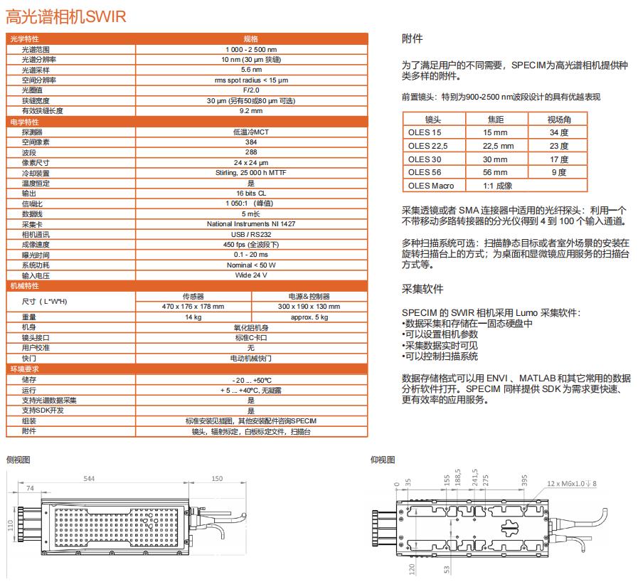 SWIR 高光譜相機是SPECIM 在短波紅外波段研發的一款性能優(you) 越的高光譜相機。這款相機擁有全新的設計和製造工藝,是短波紅外高光譜相機中重大的突破。相機在保持高速數據采集(450 fps )的同時,擁有更高的空間分辨率(384 像素),並且為(wei) 了適應室內(nei) 或室外多變的采集環境,SWIR 相機采用耐磨防水外殼IP54 以及配備半導體(ti) 恒溫裝置,隔絕外界環境的影響,保證數據的準確性。為(wei) 了確保在不同條件下的室內(nei) /室外使用,它現在具有堅固的防風雨 IP54 外殼和溫度穩定的光學元件,SWIR 相機高性能的配置反而比上一代具有更低的能耗,僅(jin) 僅(jin) 隻有50W 。