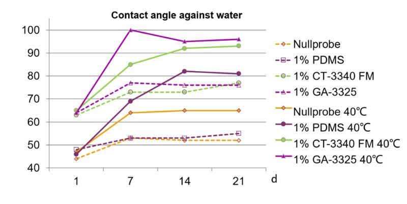 利用不同類型疏水添加劑的商用外牆塗料配方中接觸角(縱軸)隨時間(橫坐標)和溫度(常溫與(yu) 40℃)的比較,結果顯示非離子的GA3325在常溫及40℃下具有更強疏水性。