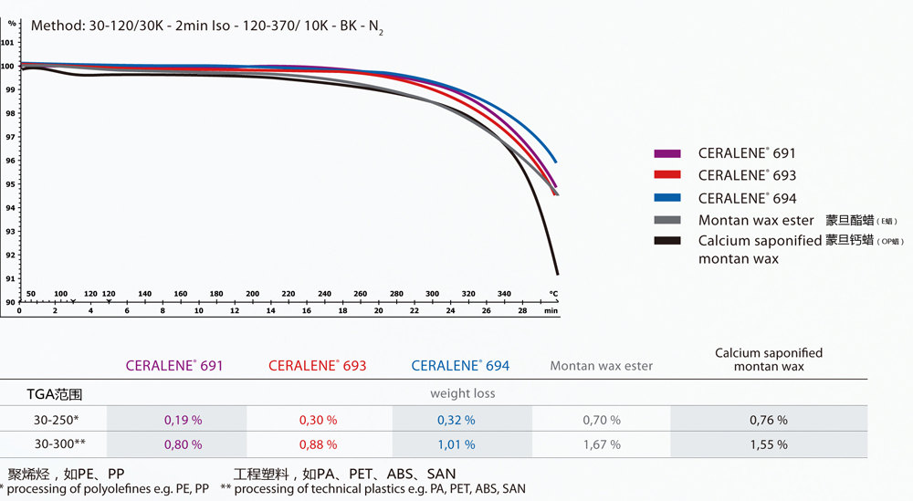 ※不同的工程用樹脂如PC,PS,PA,ABS,POM,PET,PE和PP,提供優(you) 異的溫度穩定性﹑極低的揮發性以及改善表麵光澤,不會(hui) 導致析出