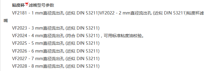 荷蘭(lan) TQC VF2181 濾嘴是荷蘭(lan) 進口的,型號是VF2181,符合DIN53211,直徑是1mm。那麽(me) ,粘度杯濾嘴不同型號參數如下: